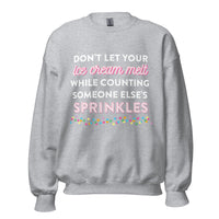 **Restocked!** Our most highly sought-after sweatshirt is now available again! "Don't let your ice cream melt while counting somebody else's sprinkles" is a powerful reminder to stop comparing and embrace your current situation by celebrating exactly what you have in front of you right now. This cotton blend sweatshirt is pre-shrunk with a classic, true-to-size fit making it so warm and comfy.